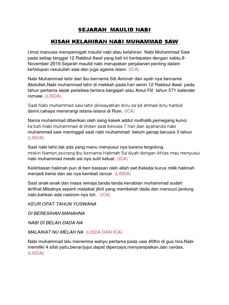 Sejarah Maulid Nabi from imgv2-1-f.scribdassets.com Terima terima kasih pengerusi majlis, barisan panel panel hakim yang arif arif lagi bijaksana bijaksana , guruguru serta hadirin sekalian. Maulid nabi merupakan perayaan untuk memperingati kelahiran nabi muhammad saw. See more of kisah kelahiran nabi muhammad on facebook. Peristiwa itu tidak lain adalah pernikahan putra abdul muthalib, abdullah dengan aminah binti wahab. Maulid nabi muhammad saw dirayakan oleh umat muslim di seluruh dunia setiap tanggal 12 rabiul awal. Dunia nabi ~ di kala umat manusia dalam kegelapan dan kehilangan pegangan hidupnya, lahirlah ke dunia dan keluarga yang sederhana, di kota mekkah seorang bayi yang kelak membawa perubahan besar bagi sejarah peradaban dunia. Sayangnya, tidak ada satu nubuat pun tentang dia dalam kitab allah (taurat, zabur dan injil). Momen ini terjadi bersamaan dengan peristiwa sensasional dimana terdapat pasukan gajah yang hendak merobohkan ka'bah, tempat suci nan bersejarah bagi.