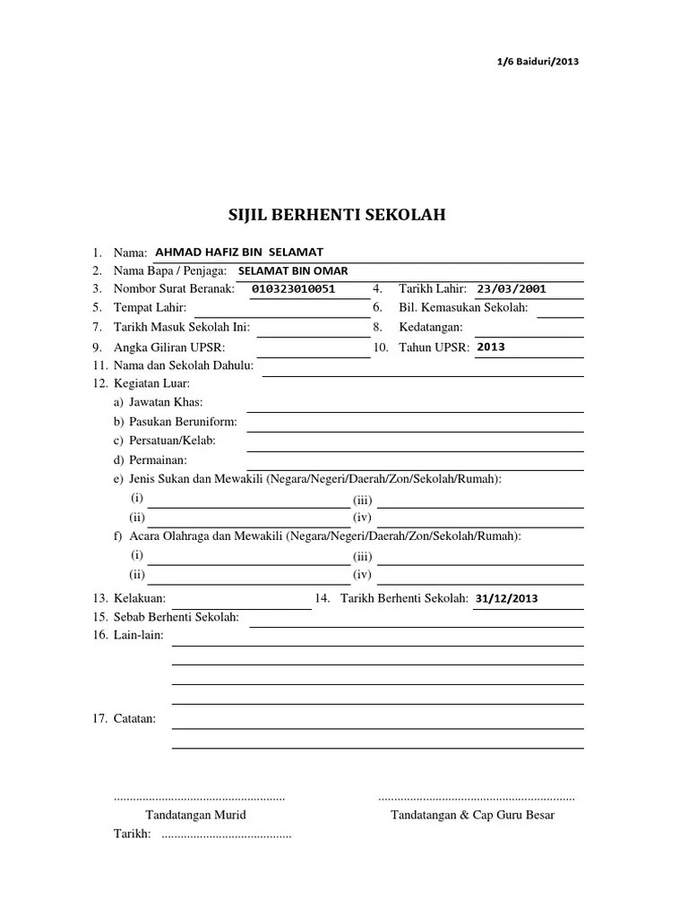 Contoh Sijil Berhenti Sekolah from imgv2-2-f.scribdassets.com Format surat keterangan pindah sekolah by iksan labuke 39286 views. Pinang tarikh berhenti sekolah : Salinan sijil upsr boleh didapatkan dari sekolah asal di mana peperiksaan upsr diambil. Tamat tingkatan 5 kehadiran tahun 2016. Please fill this form, we will try to respond as soon as possible. So please help us by uploading 1 new document or like us to download Student affairs contoh surat akuan sijil berhenti sekolah. Sijil berhenti sekolah tahun 6 sijil berhenti tahun6 t skj.