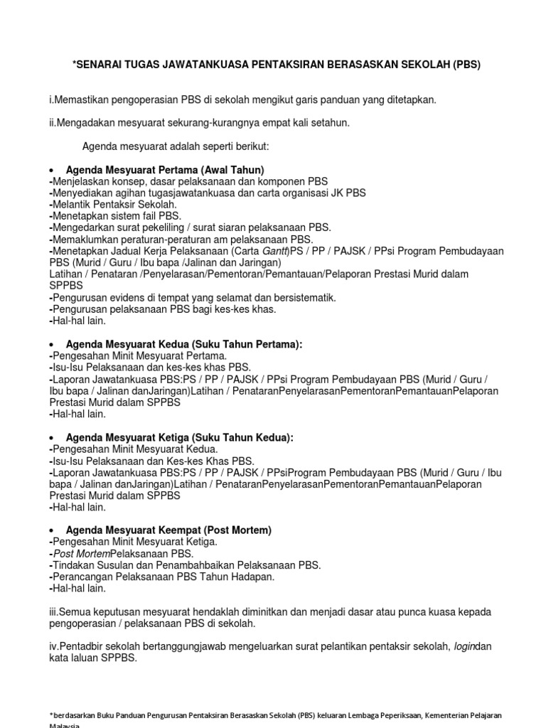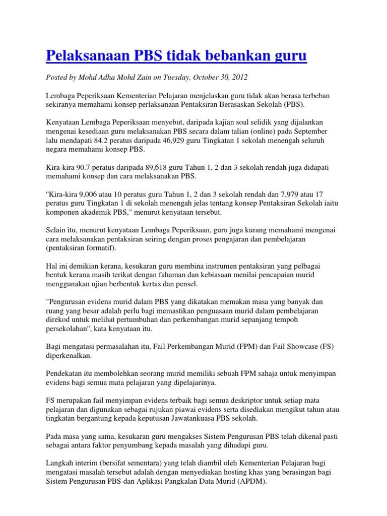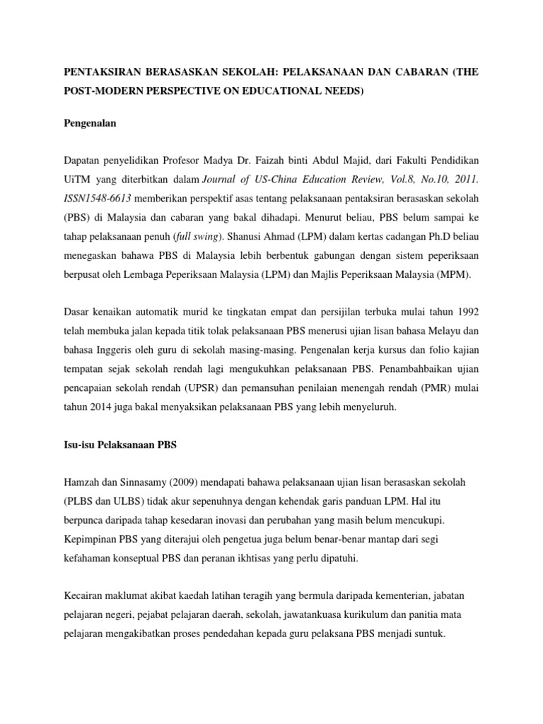 Pentaksiran sekolah dilaksanakan secara formatif dan sumatif bagi melihat perkembangan pembelajaran murid serta menambah baik pengajaran htlm.at www.oise.on ca (20 september 2008) tan ai mei 2010 pentaksiran berasaskan sekolah (pbs) di malaysia. Justeru, mesyuarat jemaah menteri bertarikh 17 disember 2010 telah bersetuju supaya pentaksiran berasaskan sekolah (pbs) dilaksanakan sebagai sebahagian daripada program transformasi pendidikan. Pbd lebih bersifat formatif iaitu mengutamakan kemajuan setiap murid dan. 4 pentaksiran pusat pentaksiran pusat merupakan pendekatan pentaksiran yang dilaksanakan di sekolah dengan peraturan pentaksiran, instrument pentaksiran, tugasan, garis panduan, peraturan penskoran dikeluarkan oleh lembaga peperiksaan (lp) pp menyediakan format dan tugasan. September 20, 2012september 20, 2012 cikgu mior ulbs bm.