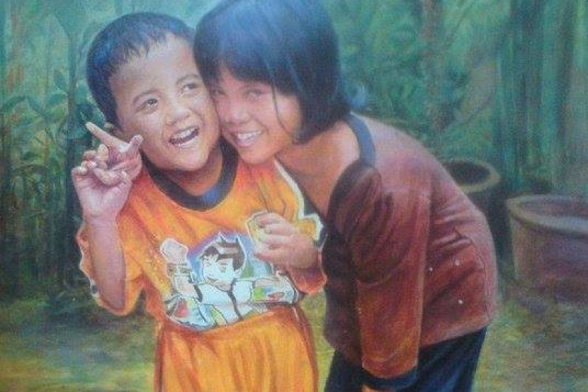 Lukisan Suasana Kampung / Ketenangan nan menyejukkan hati of kampung sampireun resort & spa.. Suasana dikampung identik dengan rasa kebersamaan termasuk dalam bergotong royong yang hal itu merupakan sudah jadi ciri. Sebuah lukisan 3d dibuat selama 'tiga jam hingga dua hari'. Lukisan sederhana namun sangat indah. Lukisan pohon pisang asli yang indah dan mempesona. Lukisan batik ini menggambarkan suasana di kampung nelayan.